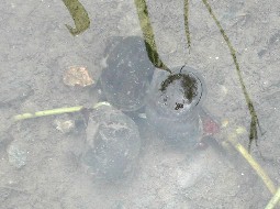 左からヤナギハナガサ、民家の畑で栽培されていたナタマメ、自然は豊かでタニシもいた ![]()