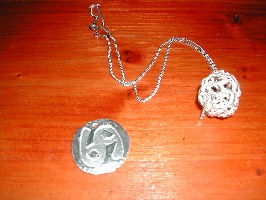 左は仕上げ前の作品(左は私が作ったもので、右は家内が作ったもの) 後日、ムトーハップによる「いぶし銀仕上げ」にしてチェーンを付けたもの ・銀粘土を丸めて平たく伸ばす。