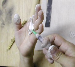 ・注射器に入った柔らかい銀粘土を花びらの裏に盛ります。