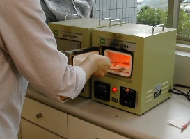 左は型紙を載せて花びらを切り取ったところ 右は焼結前の乾燥中の作品 左の写真は作品の裏側に金具を取付中 焼結炉から出来上がった作品を取り出すところ 焼結炉から取り出した作品 参考写真 ![]()
