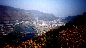 むき出しの岩ばかりの上り坂が続く、坂道の途中で見下ろした景色(旭川) 2001年11月26日撮影 山道を登り始めると、朝の冷え込みが嘘のように、汗が吹き出してくる。後から追いかけてきた