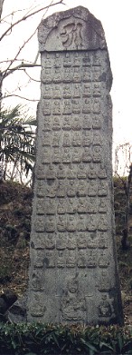 左の写真は亀島山山頂付近から鶴新田一帯を写したものです。手前に広がるのはレンコン畑です。 右の写真は亀島山のすそ野にある全面に仏様が彫られた石塔です。 2001年3月4日撮影 昼食後は雑談、とりとめもない話でひとしきり賑わいました。そして荷物をまとめて帰路に