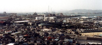 亀島山山頂付近から遠く水島コンビナートを眺める 2001年3月4日撮影 私達が山頂に着いたのは昼少し前でした。周辺の景色を楽しみながら記念写真を撮った後、