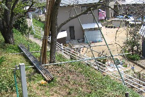 また、上の写真のように鉄パイプを使ってキウイの棚の修理を行いのり面での作業がし易いように足場を作った。