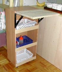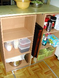 レンジと食器棚のスペースを利用した棚、手作りのワゴン(さいころBOXを利用したもの) これは、使い勝手の良い台所をという家内の長い間の夢でもありました。本来は私の定年後に計画していたこと