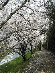 の端に立って振り返ってみますと、水路に花びらを浮かべ水に影を落とした桜並木が一幅の絵のように