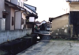 風呂屋に続く細い道、田圃であったところも埋め立てられている。 右は本陣(大名の宿泊した所) 私は風呂屋に通った道のほとりに立ってみた。ここは来る日も来る日も母と弟と一緒に風呂屋に通った道である。