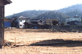 小さく見えるのが廉塾、手前が僕らがラジオ体操をしていた空き地。 茶山邸の敷地には大きな古い楠があり、その下は広場になっていた。僕らは夏休みになると、ここでラジオ体操を