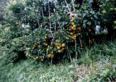 少しずつふくらみを増し色付き始めた八朔 1999年10月28日撮影 右は生口島が原産だと言われている安政柑