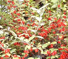 左はびっくりグミの花 2001年4月中旬撮影 右はたわわに実った実、色はオレンジから赤へと変化していく