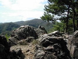 千人岩と千人岩から眺めた景色 千人岩は常山合戦時城方の退路遮断のため敵方が千人の兵を配したと言われている 山頂には大きなテレビ塔が二基立っている。周辺に電波を遮るようなものがない常山は、中継所としては絶好
