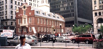 左、家内の足下にあるのがフリーダムトレイルの目印、赤いライン 右側はアメリカの独立宣言をした議事堂、ケネディもここで演説をしている。 ボストンはイギリスからの独立戦争時代の遺跡が実に多い。ポールリビアと言う人は