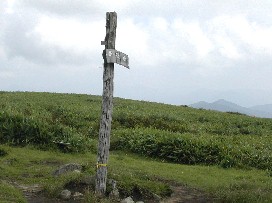 これから道後山の方に向かう標識とワレモコウの彼方に遠く道後山を眺める ![]()