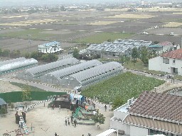 展望塔から眺めた園内の景色、左は芝生が美しい広場、右はイチゴハウスの一部が見えている。 ![]()