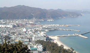 洲本城の城跡から洲本市内を 洲本市にはきれいな海岸があります。大浜公園として海水浴などで賑わうようです。砂浜の一方には古い大きな