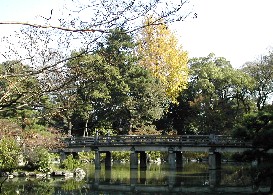 には林泉と言われる池があり、池には赤い太鼓橋が懸かっていた。例年なら真っ赤に紅葉したもみじが池
