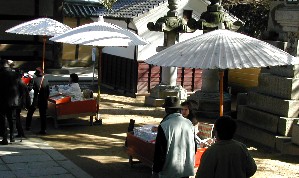 山門のそばには「五人百姓」の名前を持つ加美代飴=鼈甲飴(べっこうあめ)を売る店が、シンボルである