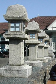 こんぴら灯籠と歌舞伎役者に銅像 琴平駅を出ると全国から街道筋に寄進された灯籠の一部が集められ並んでいる。 これは丸亀街道と多度津街道にあったものを移転 ![]()