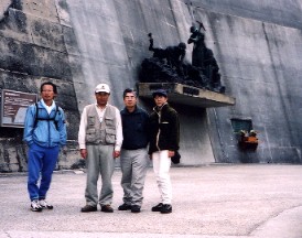 水が勢い良く吹き出ています。実に巨大なダムです。ダムの一角には殉職者を祀った像が置かれております。また、山から