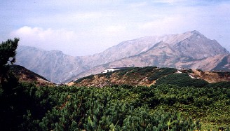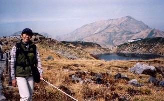 ミクリガ池をバックに、深い谷底からは硫黄の匂いが上がってくる 遊歩道もきれいに整備されており、道の両脇には這い松をはじめとする高山植物が地を這うように覆っています。ここら