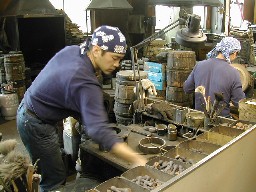 バスは一気に南下し、盛岡市内にある南部鉄器の製造販売をしている「岩鋳」に着きました。 「岩鋳」の入口にあった大きな鉄瓶と「チャグチャグ馬っこ」が展示されていました。 工場の中では三人の若い職人さん達が鉄瓶作りに汗を流していました。 中尊寺のある平泉は毛越寺など藤原氏ゆかりの遺跡がたくさんあるところです。来年、大河ドラマに