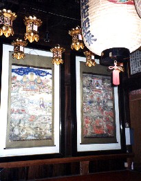 左は極楽寺境内の弘法大師お手植えと言われる長命杉、右は本堂にある地獄、極楽絵図 帰って早速風呂に行きましたが、浴場は他の建物なので浴衣を着てのんびりと言うわけにはいかず、マイクロバスに乗って