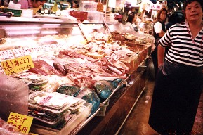 那覇市一の牧志市場、店内には肉や熱帯の魚が所狭しと並んでいた 店内では元気のいいおばさん達の客を引き留める声が聞こえる 食事の後、ショッピングをする。おみやげ用のパイナップルのおいしくて安い店を探し、送って貰う。