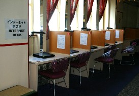 左の写真はインターネットデスク、メールでは何度かお世話になったが、使い物にならないくらい通信スピードが遅い。