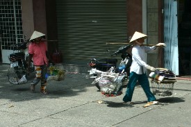 しかし、この国では人間の力も主要な移動手段だ。日本では忘れ去られた天秤棒で荷物を運ぶ姿を何回も見かけた。(写真左)