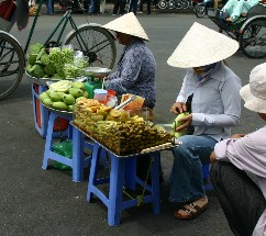 市場の外ではおばさん達が小さな露店で果物などを売っていた。(写真左)