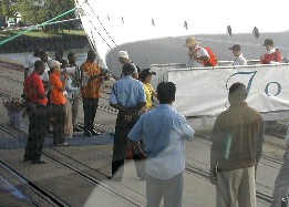 港に着岸すると、この国にあるサファリカーをすべて動員したのではないかと思われるような長い車の列が待っていた。(写真左)