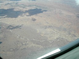 延々と続くアフリカの大地。総じて乾燥した気候のためか緑は少ないようだ。帯状に見える森は椰子林だろうか。(写真左)