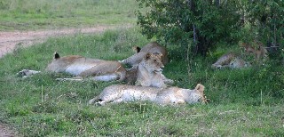雌ライオンの一家であろうか、すぐ側の木の下で何頭ものライオンが寝転んでいた。(写真右)