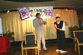 IさんとOさんの名コンビによる軽妙なハンカチマジック。(写真左)
