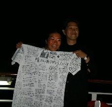 中村さんには感謝の気持ちを込めて寄せ書きのTシャツを贈った。中村さんとピースボートスタッフのAちゃん。(写真右)