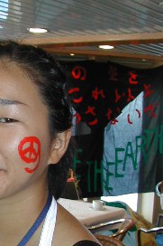 憲法九条をアピールしようと頭やほっぺたにペインティング。(写真上)