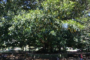 従って、こんな巨樹もある。右側に小さく写っている赤い服の女性と比べて見ると木の大きさが分かる。(写真左)