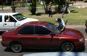 従って、犯罪も多いし、この写真のように定職もなく車のフロントガラスを掃除して小銭を貰ったり(写真左)、