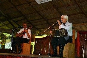 踊りの紹介や各国の観光客の紹介をしながら演奏をしていたギターとバンドネオンの奏者。(写真上)