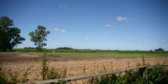今まで見てきたような建物が途切れてしまう頃、広大な牧場や畑が道の両サイドに見え始めた。(写真左、右)