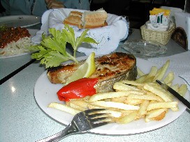 夕食にと頼んだ大きな料理皿には、これまた大きな切り身の鮭が出てきた。(写真右)