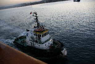 港には貨物船などの他にチリ海軍の船も何艘か停泊していた。タグボートが巻き上げる海水