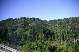 バルパライソの町(写真左)を抜けると山あいの道になった。この当たりは緑豊かな山だった。(写真右)
