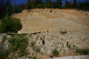 山を切り開いて作った道らしく、斜面の養生は何もなく地肌が露出していた。地震国らしく複雑な断層が見られた。(写真右)