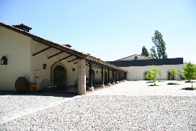 郊外には見渡す限りのブドウ畑が広がり(写真左)、その畑の奥の方にはワイナリーらしき白い建物があった。(写真右)