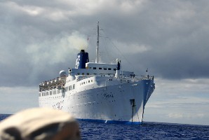 沖合に碇を降ろしたピースボートの「トパーズ号」(写真右)