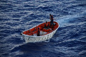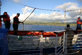 トパーズ号からは救命ボートが降ろされ、いつでも救助に駆けつけられるような体制で運搬が開始された。(写真左)