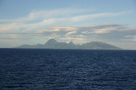 船首の上甲板に出てみると夜明け前の海の彼方にタヒチらしい島影が見えた。いよいよ着いたぞ。