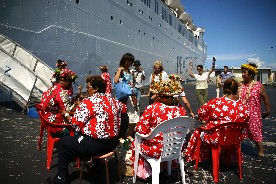 再び船上デッキに出てみると船の外ではタヒチの人達が来て歓迎の歌を歌っていた。その前