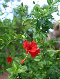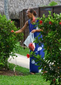 今日迎えるお客さんのために摘んでいるのだろうか。ハイビスカスの花を摘んでいる女性。(写真右)